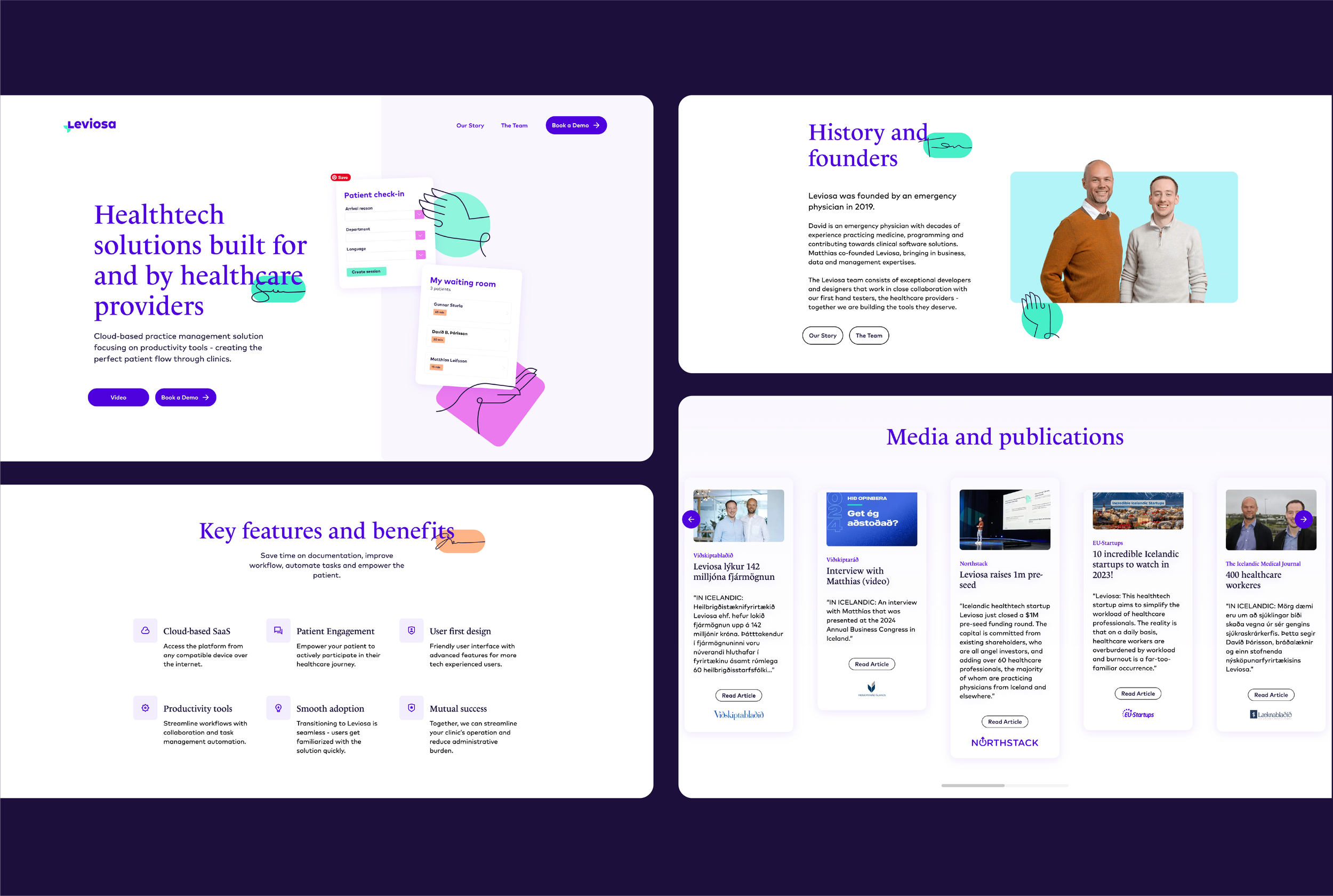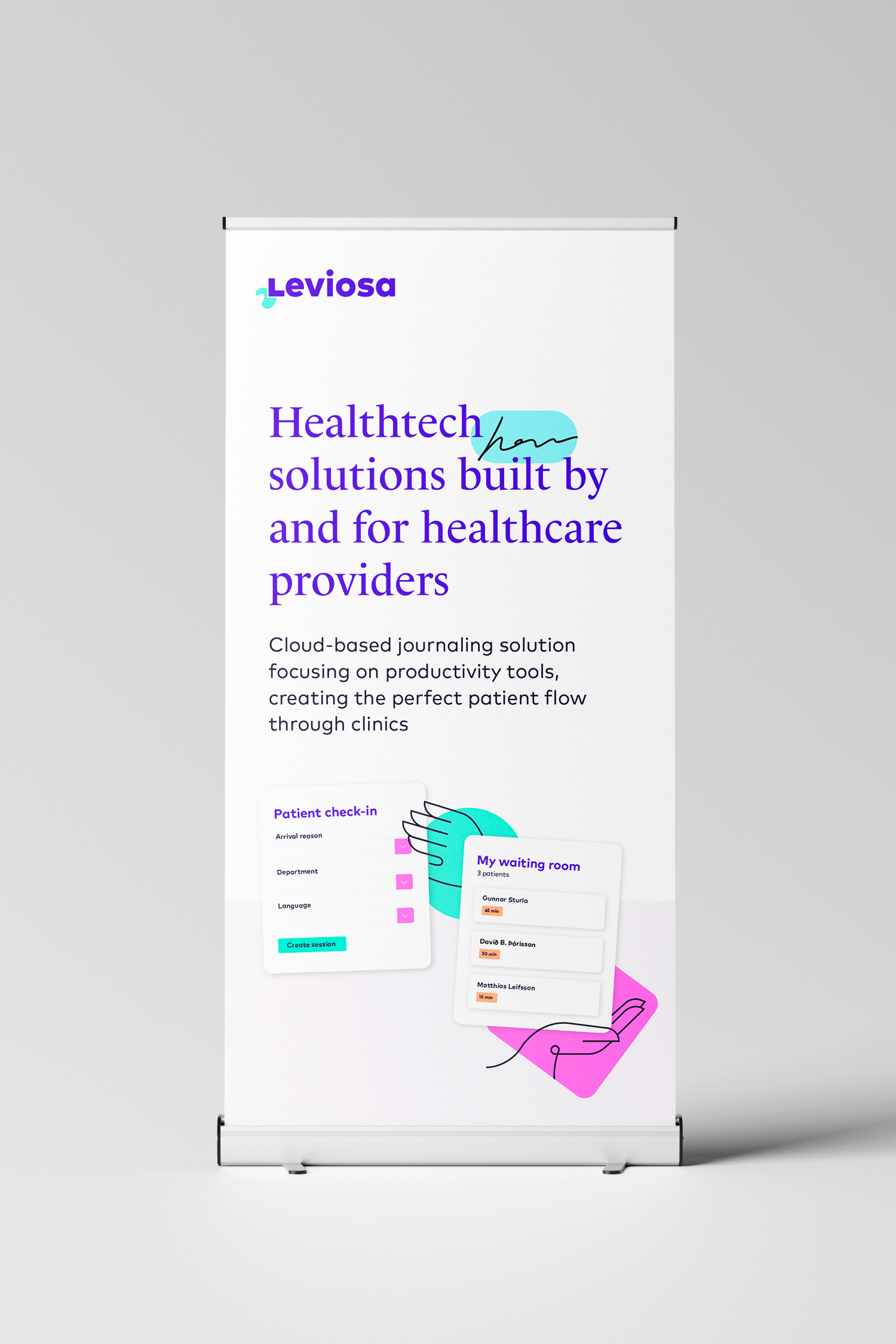 Verkefnið fól í sér endurmörkun Leviosa og samræmt útlit sem teygir sig svo yfir í veflausnina þeirra. Nálgunin er björt og aðgengileg, ljósir bakgrunnar með skærum tónum hér og þar sem vísa í læknasloppa sjúkrahúsa. Fyrirsagnaletrið Le Monde vísar í gamla tímann og hefðbundin serifletur, mætir nútímalegu sans serifletrinu FF Mark. Myndlýsingarletur er svo sérteiknað og vísar í „læknaskriftina“ svokölluðu sem oft og tíðum birtist sem línuteikning frekar en orð.